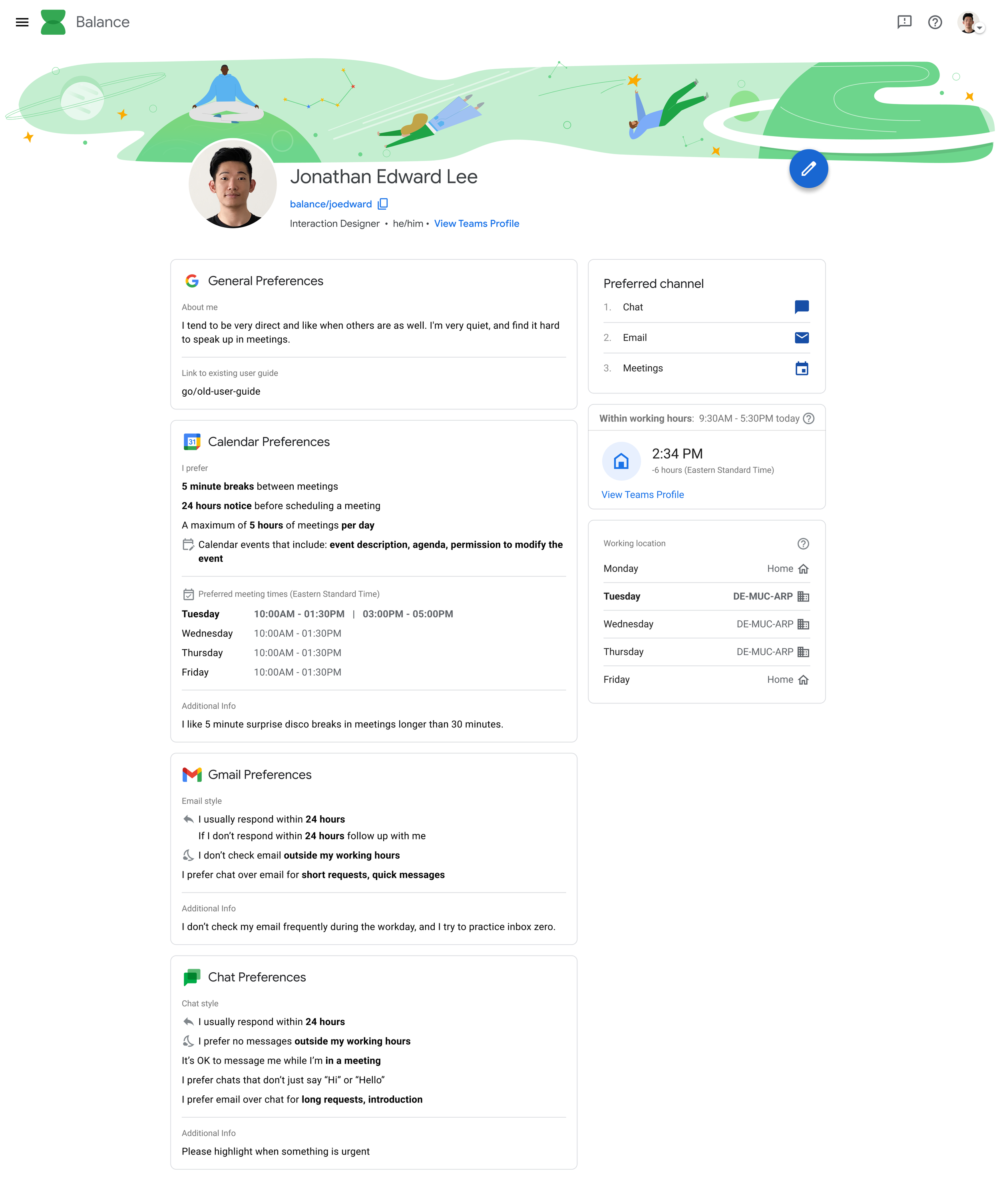 In 2019, Google established a group called Connect to cater to the needs of its employees, referred to as Googlers. This group was divided into specific domains, with the Distributed Workplace domain being the largest. With a team of over 80 cross-disciplinary peers located in NYC and Germany, I was part of a four-person leadership team alongside a Product Manager, Engineering, and Program Manager lead. Our mandate was to enable better connections among Googlers regardless of their location, and our work was intended for internal use as well as for consumer and enterprise Workspace customers.