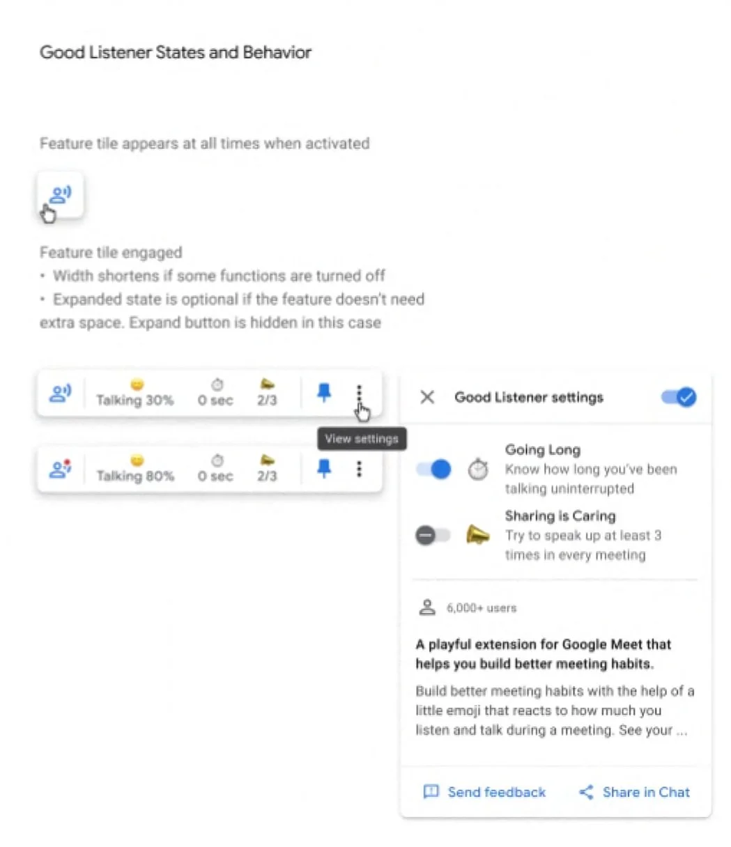 I led efforts on the team to design an efficient and effective experimentation process for our teams. We needed a way to quickly align on the right validation criteria and determine the right type of testing required. More complex interactions, like a virtual workspace, required a working prototype. Simpler ones like showing working location in Meet only needed a short description or a mock.